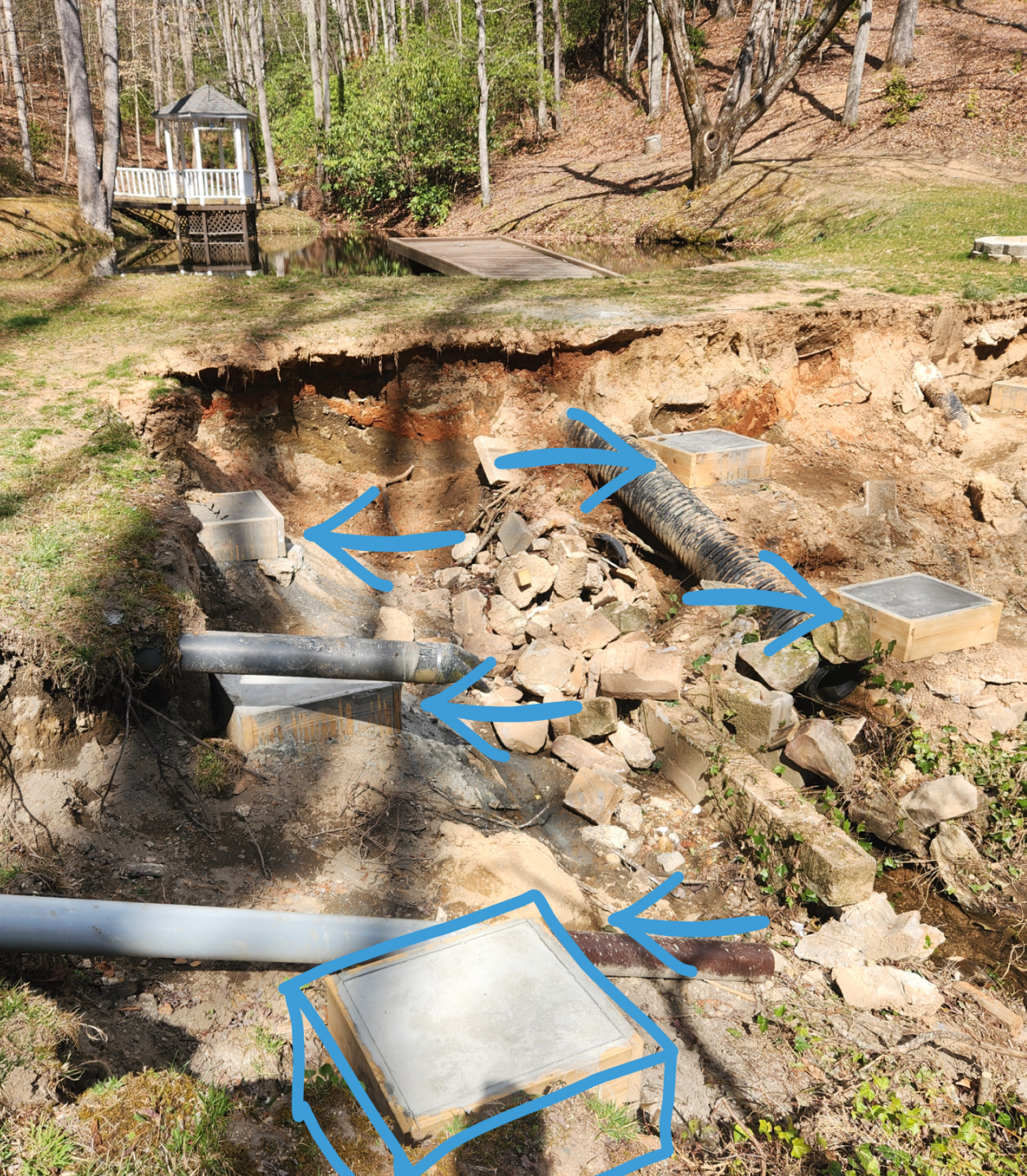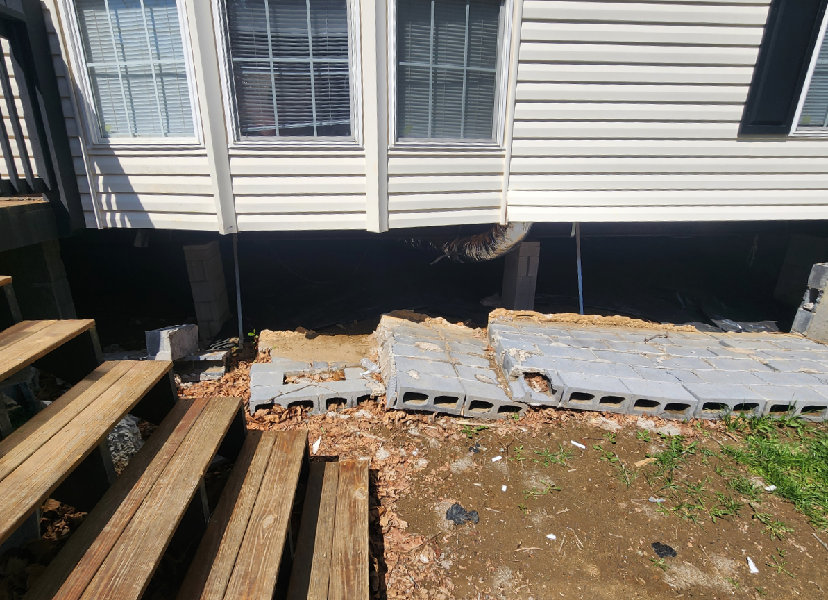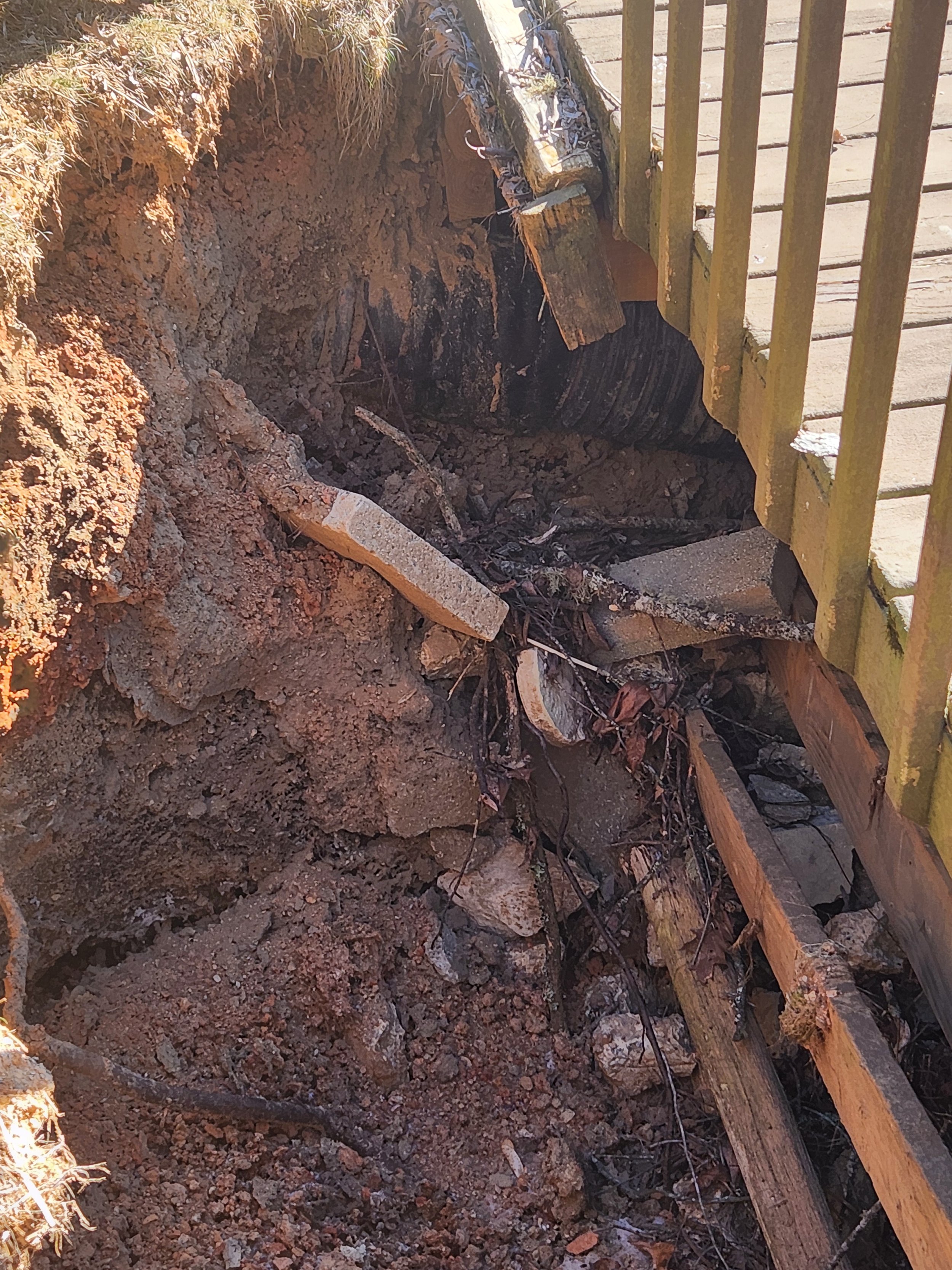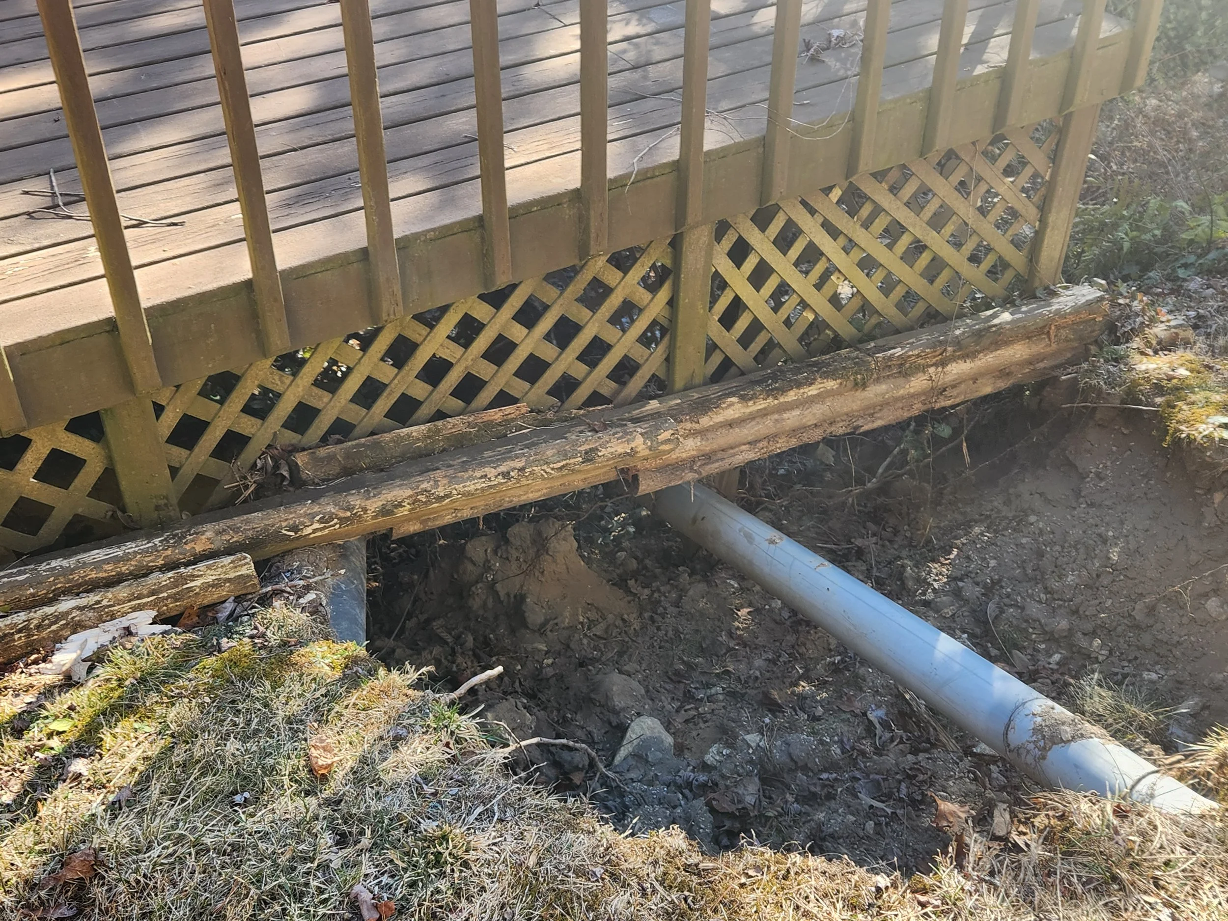 Water had undermined the deck's foundation, creating voids where solid earth had once supported the structure. Old wood lattice skirting concealed deteriorating supports, and drainage infrastructure that should have been buried was now completely exposed. The structural integrity was compromised.