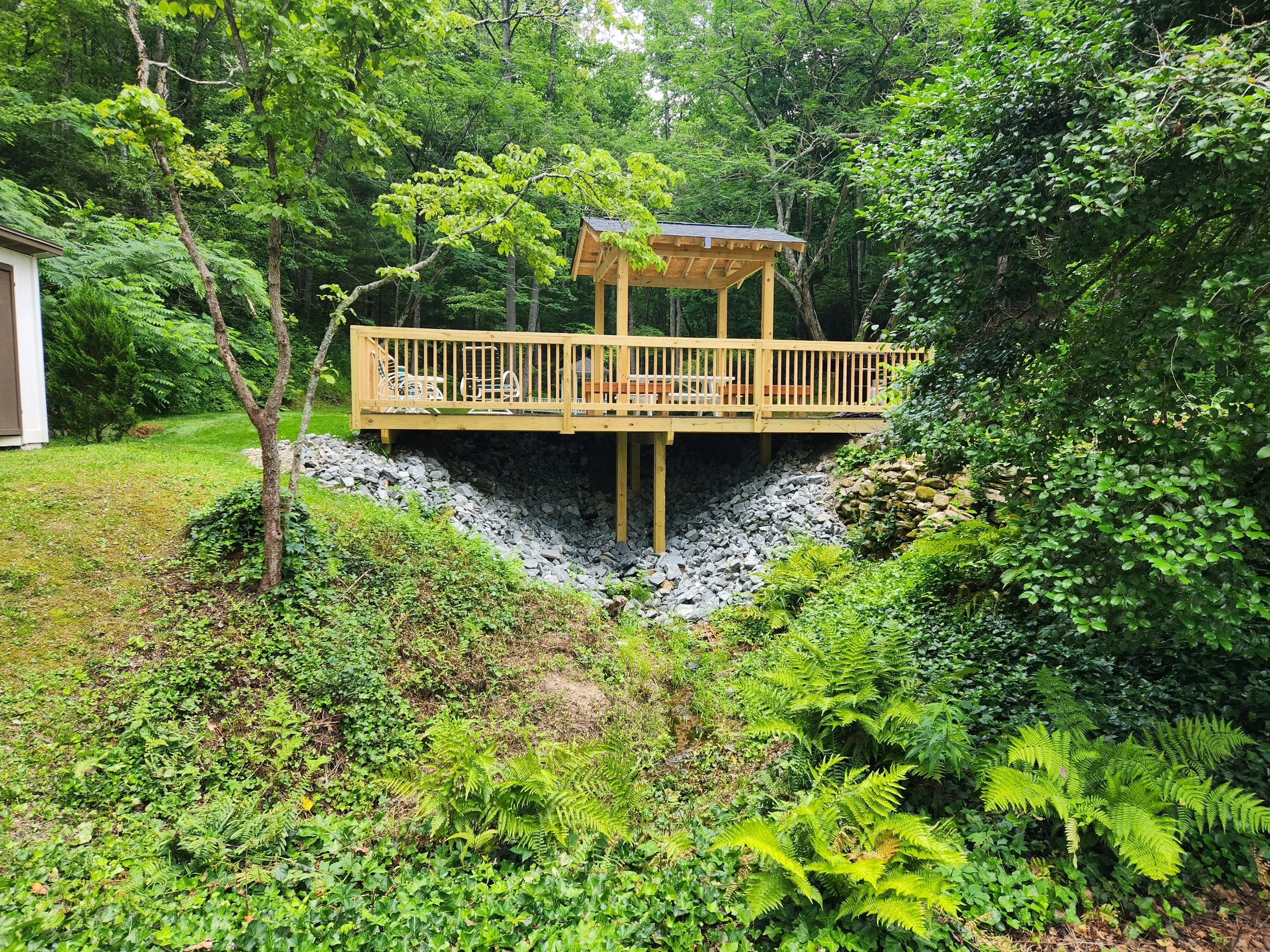 The completed project features TREX decking with a new patio cover over the table. From below, the natural stone integrates more seamlessly with the landscaping, while the deck above provides a safe, stable platform for relaxing and entertaining. The family's outdoor retreat has been restored with a safer, sturdier structure built to last, and built better than it was before.