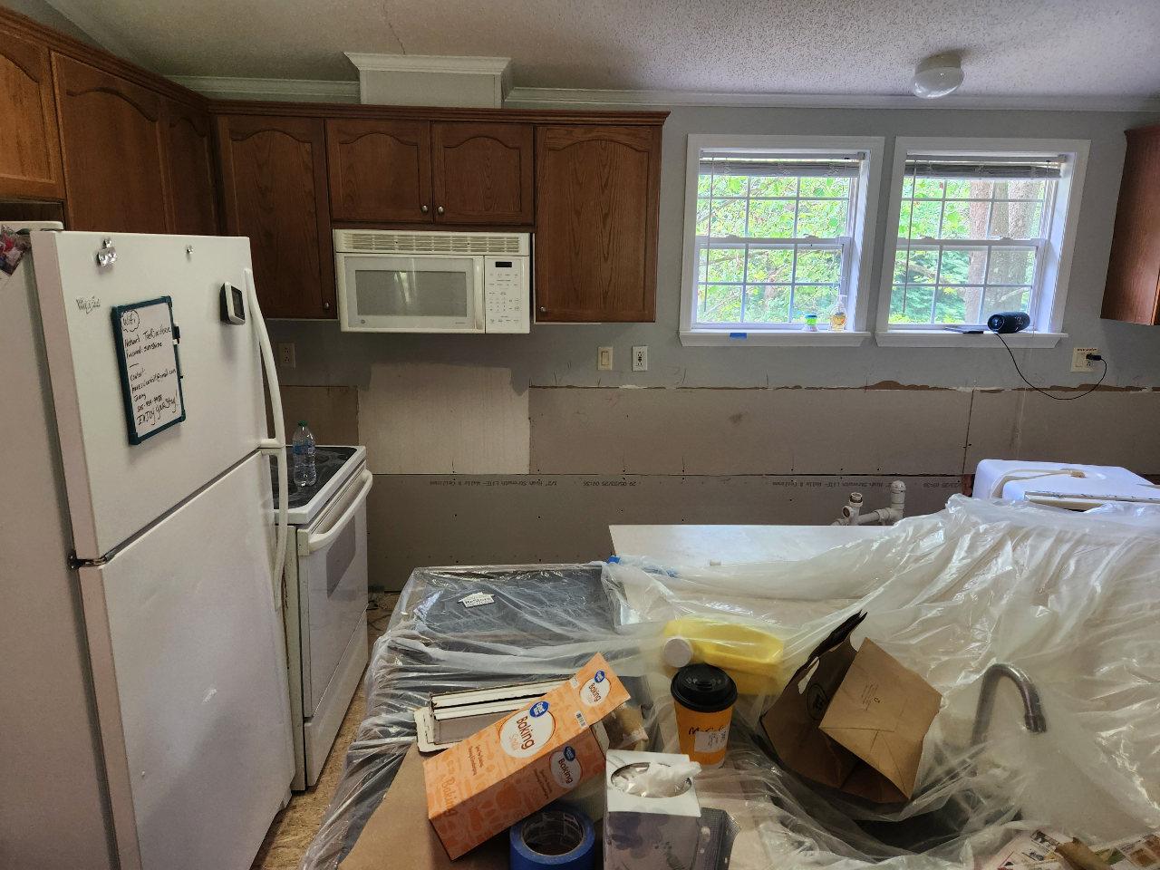 All cabinetry, base boards, countertops, missing dry wall in every room, and all flooring was replaced.