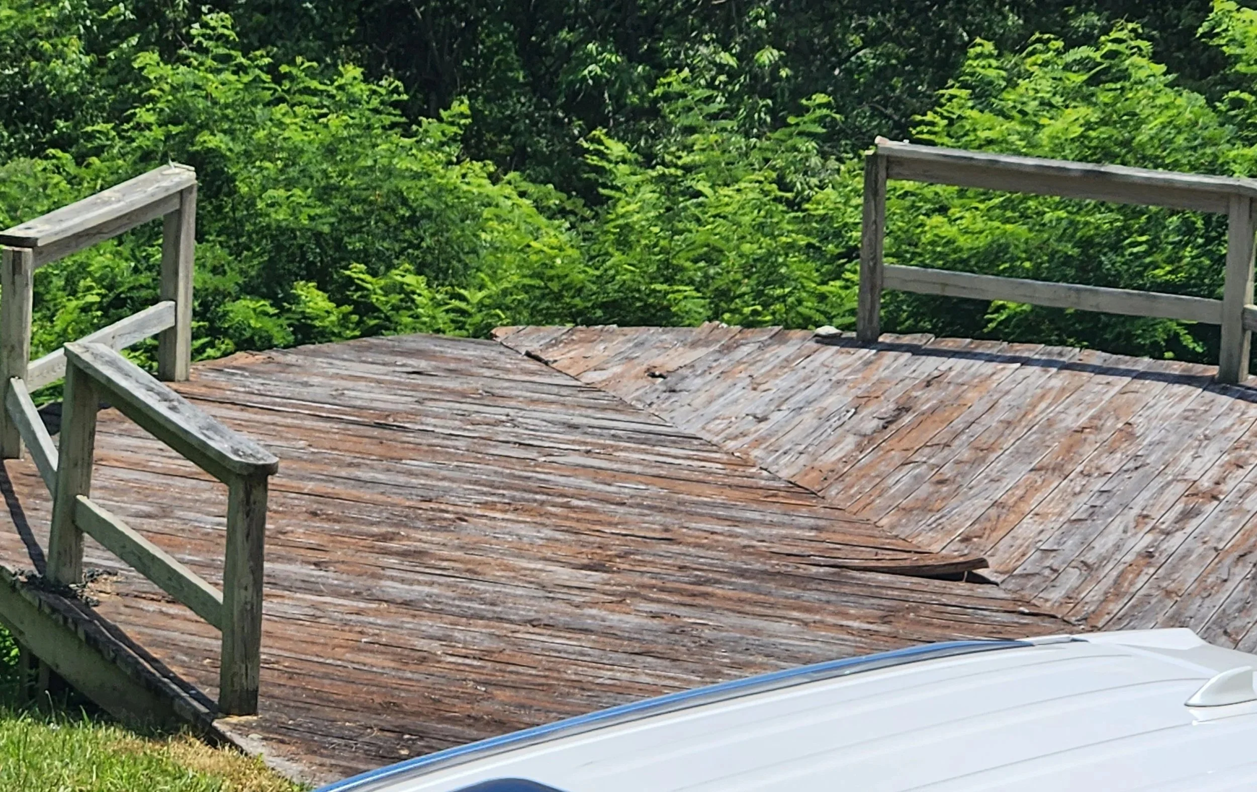 Upper deck: An unsafe, leaning handrail on the second floor, and rotted support posts